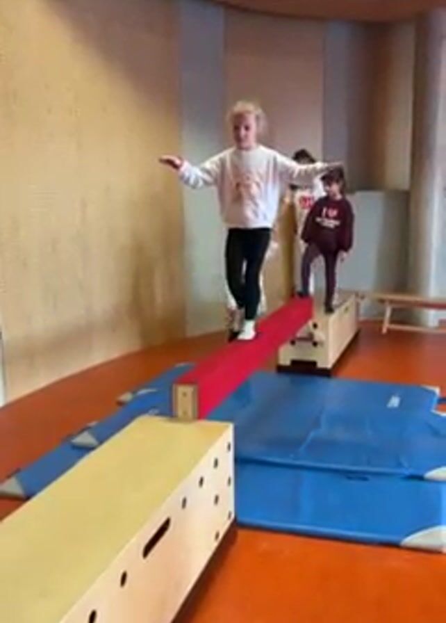 A young girl with blonde hair walks across a red balance beam, supported by two wooden boxes, in an indoor gymnasium or playroom