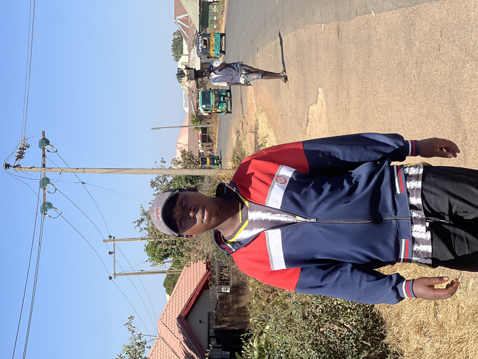 A young male subject stands centrally in the foreground, looking directly at the camera, on a bright, clear day in Du, Nigeria. He is wearing a grey baseball cap with a red logo, a red and navy blue full-zip track jacket with a white horizontal stripe and a circular emblem on the left chest, a black and white patterned t-shirt underneath, and black athletic pants. His hands are down by his sides. Behind the subject, a paved road extends into the background, flanked by a dirt shoulder on the right and low vegetation on the left. A second male figure, wearing a dark sleeveless vest over a light shirt and patterned shorts, walks away from the camera on the right side of the road, carrying an object on his head. His right hand is raised to his ear. Several green and yellow three-wheeled motorized rickshaws are visible on the road further back, one with license plate "JTB-176S". To the left of the main subject and in the mid-ground, residential buildings with red-tiled roofs and off-white walls are present, some bordered by fences topped with barbed wire. Multiple wooden utility poles with overhead power lines, featuring green glass insulators, are positioned along the street. The sky is clear blue.