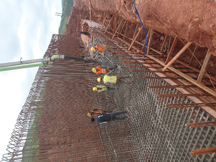 The image depicts an active construction site in Fdalate, Morocco, under an overcast sky. Six individuals, identified as male construction workers, are observed within the frame. Five workers wear yellow hard hats and high-visibility safety vests (three orange, two yellow-green). One worker in the foreground left wears a dark jacket and grey trousers, without a visible hard hat or vest. The central activity involves the pouring of wet concrete from a large green and black pump hose, which extends downwards from an unseen concrete pump truck. The concrete is being deposited into a prepared area consisting of a dense, rectangular grid of steel reinforcement bars (rebar), forming a foundation or slab. Adjacent to this pouring area, on the left, a tall, extensive wall of vertical rebar rises from a reddish-brown earth embankment, indicating the construction of a substantial retaining wall or structural element. On the right side of the concrete pouring zone, a wooden formwork structure is in place, defining the boundary of the concrete pour. This formwork is supported by wooden bracing within an excavated trench of reddish-brown soil. A blue hose and various dark cables are visible near the wooden formwork. The surrounding environment consists of exposed reddish-brown soil, forming embankments and excavated trenches. In the distant background, hilly terrain covered with green vegetation is visible.