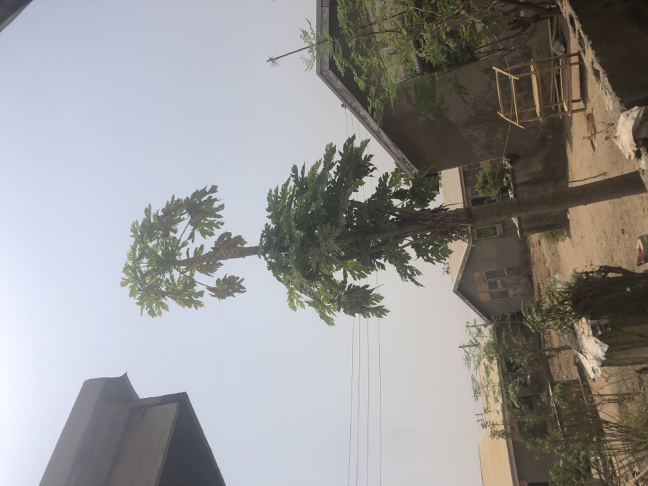 This image displays an outdoor daytime scene in Masaka, Nigeria, under a hazy, light blue sky. A tall, slender papaya tree with a thick trunk and prominent green foliage, including visible fruits, stands centrally. In the upper left foreground, a section of a light brown roof overhang is present. The midground and background feature multiple single-story buildings constructed from unpainted concrete or block, distinguished by light brown or tan roofs. These structures are situated on a reddish-brown dirt ground. Multiple thin utility lines are visible horizontally across the left side of the frame. To the right, a light-toned, multi-tiered wooden shelf or rack stands near one of the buildings. Scattered small green plants and shrubs are interspersed throughout the scene. No individuals are visible.