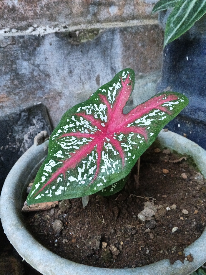The image depicts a single, prominent leaf of a Caladium plant, likely situated in an outdoor or semi-outdoor setting in Bien Hoa, Vietnam. The leaf exhibits a distinct cordate or sagittate shape, characterized by a vibrant fuchsia or bright pink central venation pattern radiating outwards across the leaf blade. The primary coloration of the leaf is green, speckled irregularly with white blotches or variegations, particularly concentrated between the veins. The plant is rooted in a light grey, rough-textured cylindrical pot, appearing to be constructed from concrete or unglazed ceramic. The pot contains dark brown soil mixed with small pebbles and organic debris. In the background, a weathered masonry wall, possibly concrete or painted brick, shows areas of discoloration and light grey patina. To the upper right, a partial view of another plant's green, striped leaf is visible, alongside a dark, indistinct object. No human figures or direct actions are present in the scene.