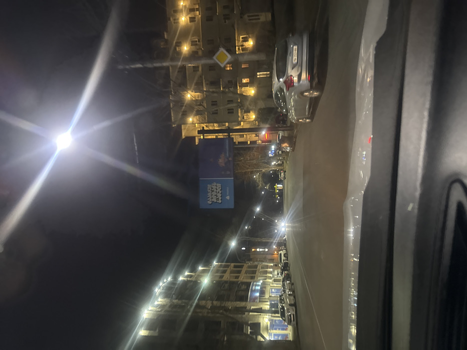Night scene viewed from inside a car. Streetlights illuminate a straight road lined with parked cars. Buildings with lit windows stand on either side. A blue billboard is visible on the left. A main road sign is present near the upper left corner. A silver car is parked along the right side of the road. Parts of the car interior are visible on the right side of the frame.