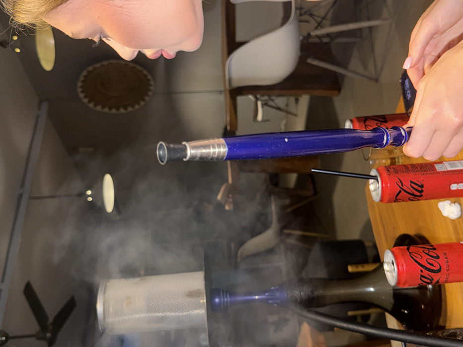 The scene is set indoors within a lounge or cafe located in Kuta, Indonesia. In the foreground, a young female, with blonde hair, is visible in profile on the right, her lips pursed. Her right hand holds a blue hookah hose with silver metallic bands. On the light wooden table, two red Coca-Cola Zero Sugar cans are present, one containing a black straw. A small crumpled white object lies between the cans. A black smartphone displaying "10:36" is visible near her hand. To the left, a dark-colored hookah, with a blue stem, is actively emitting a significant volume of white smoke from a large, cylindrical, mesh-like heat management device positioned on its bowl. A black hookah hose extends from the base of the hookah. In the background, another individual is dimly visible, seated at a dark wooden table with white modern-style chairs. The interior features gray walls, a circular woven decorative piece on the wall, dark ceiling fans, and white dish-shaped pendant lights. The ambient air is visibly diffused with smoke.