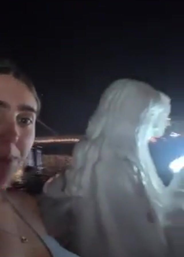 A young woman holds a lollipop in her mouth while taking a selfie video at night. She is standing next to a white statue of a seated woman holding a glowing object that looks like a phone. The background includes a body of water and lights from a nearby structure. The woman in the video looks directly at the camera, sometimes taking the lollipop out of her mouth to smile.