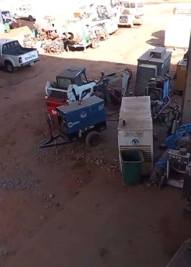n outdoor storage area with various pieces of equipment and vehicles. The view is from an elevated position under a structure providing shade. In the foreground, there is a blue Miller welding machine on a trailer, along with a white Bobcat skid steer loader. Several other machines and equipment, including an air conditioning unit and various engines, are stored nearby. In the background, several trucks and vans are parked in an open area under a large shed. A white Toyota pickup truck is visible to the left. The ground is mostly dirt and gravel.