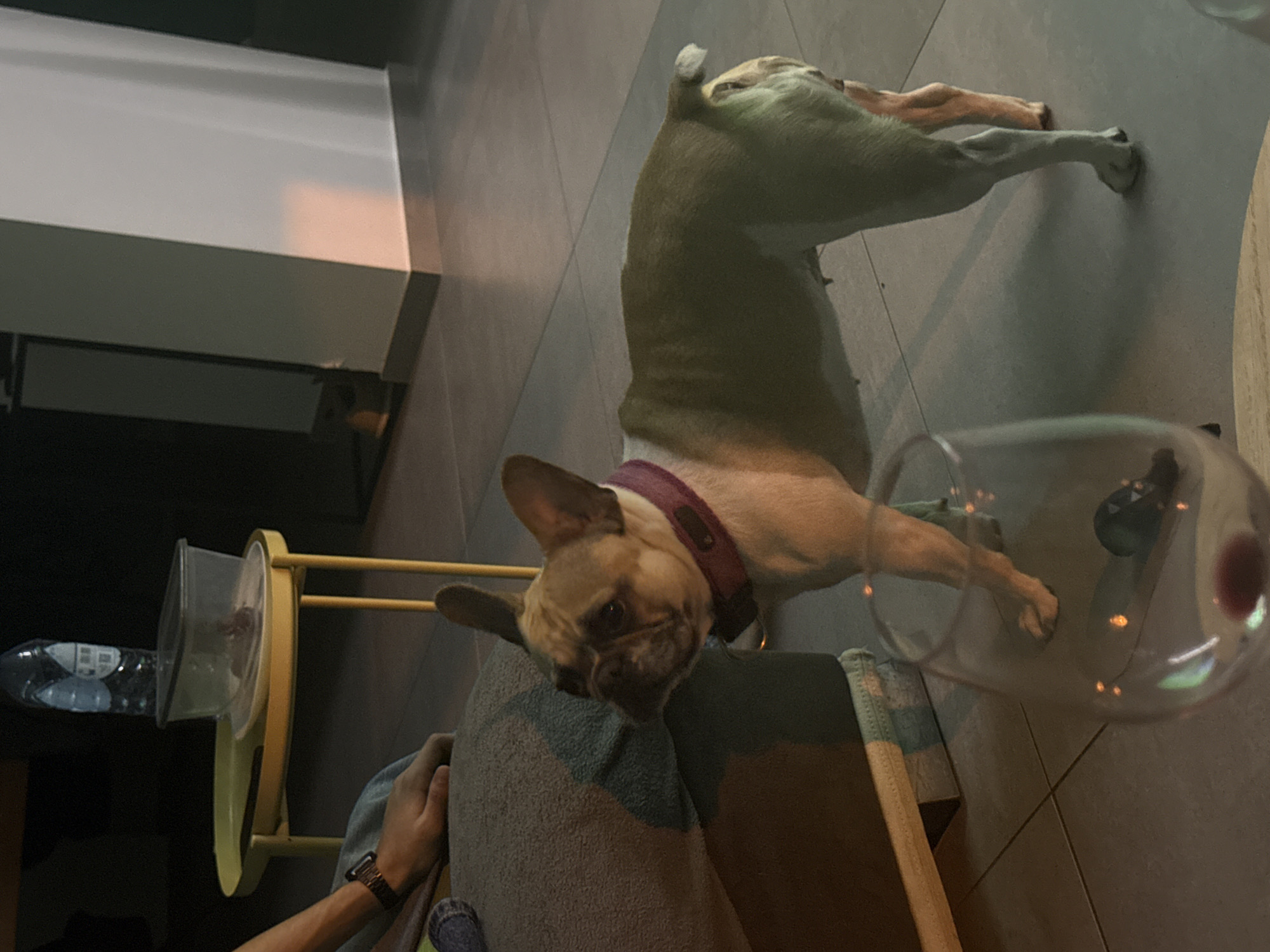 An indoor scene, likely a residential living area in Unknown, Unknown, is depicted at night. A fawn-colored French Bulldog, wearing a purple collar, stands on dark tiled flooring, facing left with its head slightly turned. A clear wine glass containing red liquid is partially visible in the immediate foreground. To the left, a person's arm, wearing a dark smartwatch, rests on a light blue upholstered sofa or cushion. In the background, a yellow two-tiered side table holds a plastic water bottle and a clear lidded container with food on a white plate. A white architectural column or wall with a warm light reflection is visible to the right.