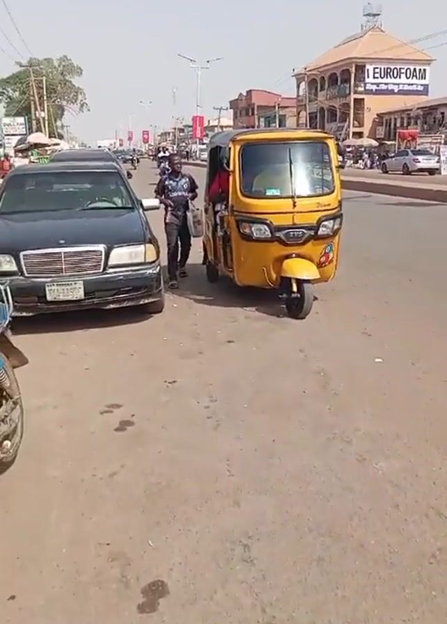 young man standing on the side of a road in front of a yellow auto rickshaw, also known as a keke or tuk-tuk. The man is wearing a patterned shirt, dark pants, and sandals, and is holding a white plastic bag. He appears to be talking to someone inside the rickshaw. To the left of the rickshaw, a black Mercedes car is parked. The street is moderately busy with other vehicles and pedestrians. In the background, there's a building with a sign that reads "EUROFOAM". The sky is bright and clear, suggesting a sunny day. The road appears to be paved but shows some wear and tear.