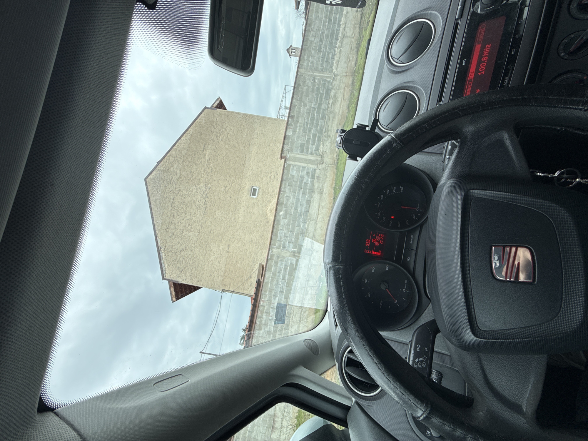 The scene is an interior view from the driver's seat of a car, possibly a SEAT, looking out onto a cityscape in Panagyurishte, Bulgaria. The foreground is dominated by the car's dashboard, steering wheel, and instrumentation panel showing a radio frequency of 100.8 MHz. Outside, the view is of buildings and a cloudy sky. The architecture appears to be a mix of older structures with a light-colored facade and brickwork, possibly residential buildings or a combination of residential and commercial. A concrete wall is visible separating the car from the buildings in the background. The weather seems overcast, judging by the sky. There is no visible human presence in the frame.