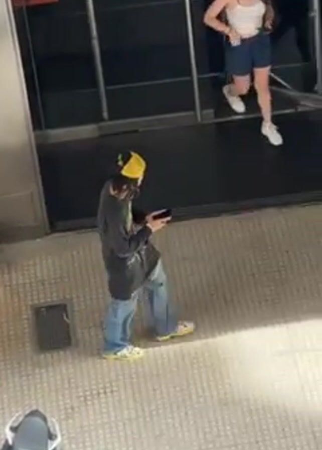 - "person wearing a black and yellow baseball cap, a long-sleeved gray shirt, baggy light blue jeans, and yellow and white Crocs, walking while looking at a cell phone" by FM-x5Zlm1, licensed under CC BY 4.0