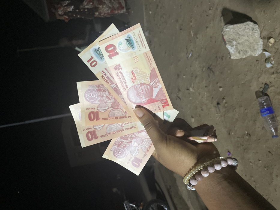 A hand holds multiple 10 Naira bills, the currency of Nigeria, featuring a portrait of Alvan Ikoku, a prominent educationist. The bills are fanned out, displaying the "10" denomination and "Central Bank of Nigeria" text. The hand is adorned with beaded bracelets. The background shows a dark area suggesting night or low light conditions on one side and a partially visible rough, concrete-like surface with debris and a water bottle on the other side.