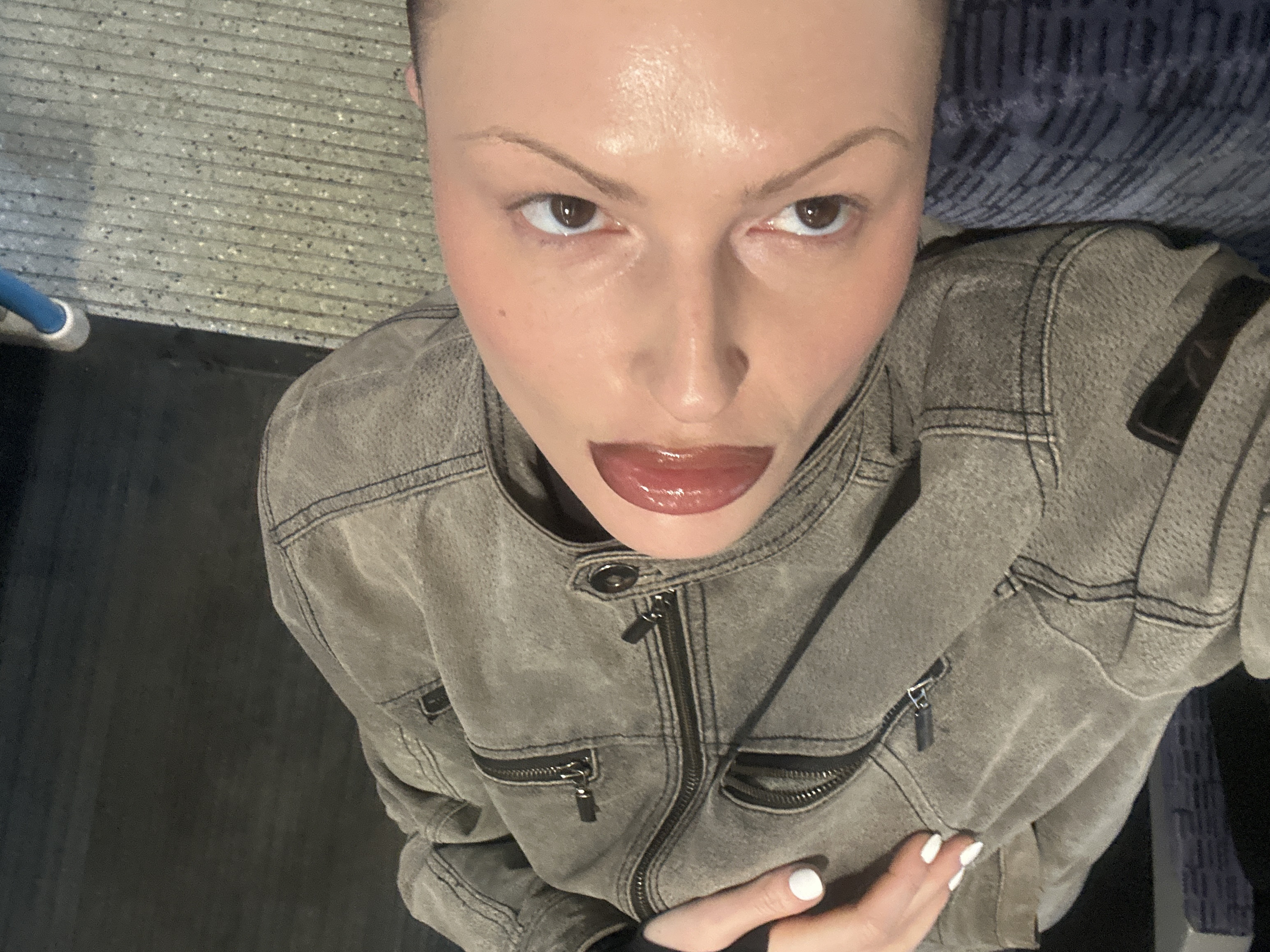 A close-up, high-angle portrait shows an individual with light skin, brown eyes, and dark, arched eyebrows, wearing red lip gloss. The subject is dressed in a faded grey/khaki-colored jacket with multiple black zippers and a buttoned collar. A black undershirt is visible beneath the jacket. The left hand, displaying white manicured fingernails, rests on the jacket. The background to the upper right reveals a light grey, vertically ridged floor surface with dark specks, consistent with a public transport interior or station platform. A blue vertical handrail with a white cap is also present in the upper right. The darker upper-left background is indistinct. The scene is located within the administrative area of Tonbridge and Malling, United Kingdom, specifically in an environment indicative of public transport such as a train station or on a train/bus.