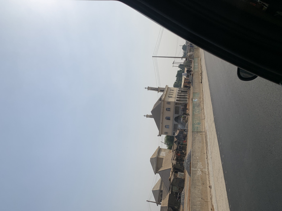 The image depicts a roadside scene in Gora, Nigeria, under clear, sunny skies. In the immediate foreground, a freshly paved, dark asphalt road is visible. A low, grey concrete barrier with "30+000" painted in white lettering separates the road from the adjacent terrain. The right side of the frame is partially obscured by a dark vehicle window frame and side mirror. Beyond the barrier, a diverse collection of structures and activity unfolds. Prominently featured in the center is a light-colored, two-story building, likely a mosque, characterized by a central domed roof, arched windows on the upper level, and an arcade of arches on the ground floor. Two slender minarets with conical tops flank the main structure. To the left of the mosque, multiple single-story buildings with light-colored walls and hip roofs are visible, interspersed with several informal, possibly makeshift, structures constructed from corrugated metal or similar materials. Piles of grey aggregate (gravel) are scattered on the ground. Numerous individuals are present, clustered around the buildings and piles of material. Some appear to be standing or walking. One area in front of the mosque shows a plume of light-colored smoke or dust rising from ground level. Further to the right, a power pole with multiple overhead lines extends vertically. The background consists of a clear, light blue sky, with the sun's glare visible in the upper right quadrant.