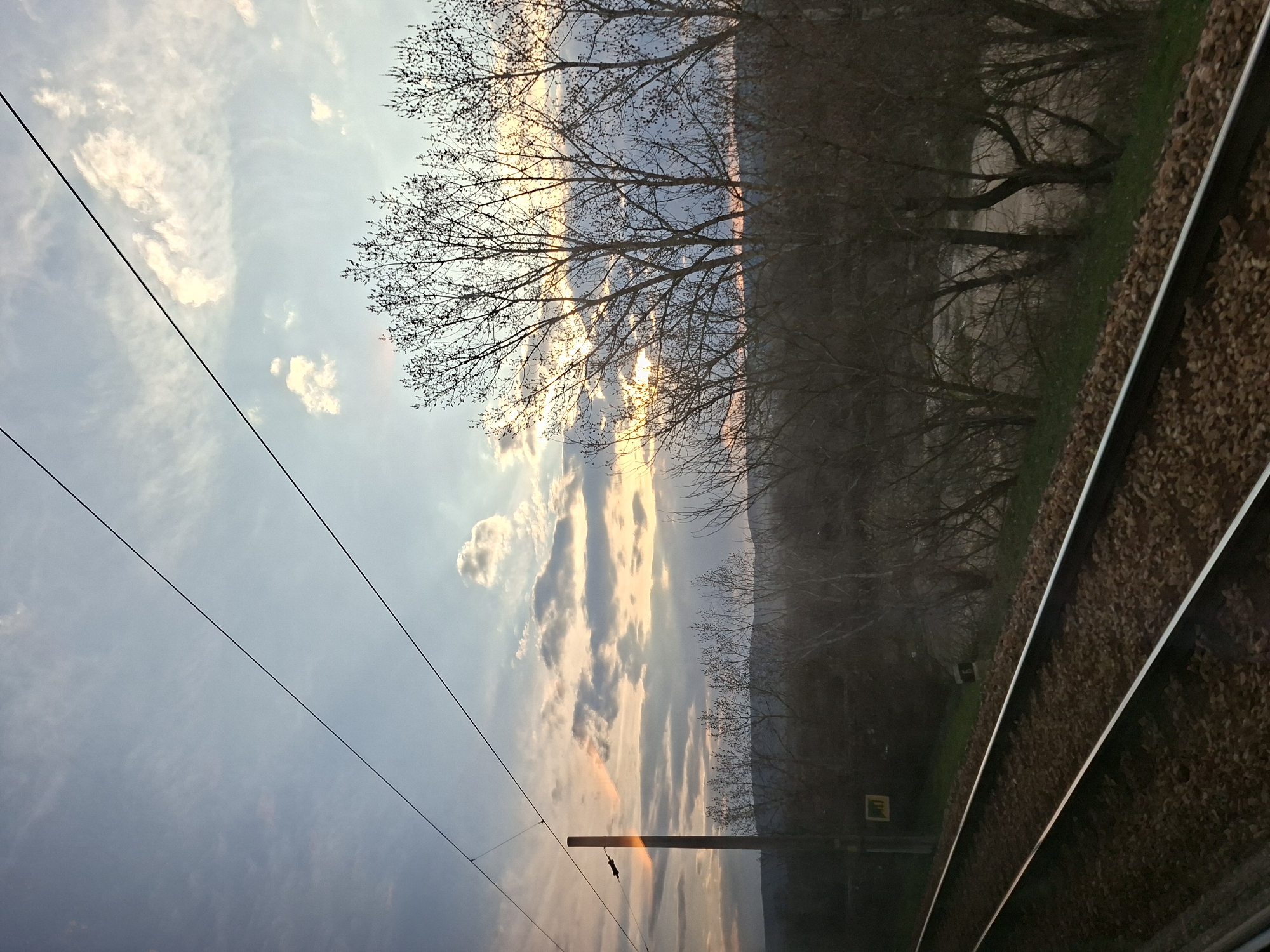 Location: Unknown, Unknown. The image displays a landscape view, consistent with observation from a moving train. In the lower left quadrant, two parallel railroad tracks are visible, constructed from steel rails on a bed of dark gravel ballast. A tall, dark utility pole is positioned vertically on the left, exhibiting a stripe of orange-yellow light along its right side. Overhead lines, part of a catenary system, extend diagonally across the upper portion of the frame. A small, rectangular yellow sign is attached to a lower pole section near the tracks, and a white marker bearing the numeral "5" is situated further to the right near the track embankment. The midground features a dense line of bare deciduous trees, their branches silhouetted against the sky, suggesting late autumn, winter, or early spring. Beyond these trees, a calm body of water is visible, stretching towards a distant line of low hills forming the horizon. The sky is partly cloudy, with scattered stratocumulus clouds illuminated by a setting or rising sun, which is obscured by the trees on the right. The sky transitions from warm orange and yellow hues near the horizon to lighter blue and grey in the upper left. No individuals or active interactions are present in the scene.
