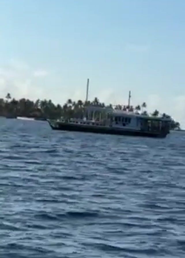 large boat sitting on the ocean. The ocean is a deep blue with white-capped waves. There's an island in the background lined with trees. The sky is a pale blue with a few white clouds. The boat is white and dark blue. The camera appears to be moving forward.