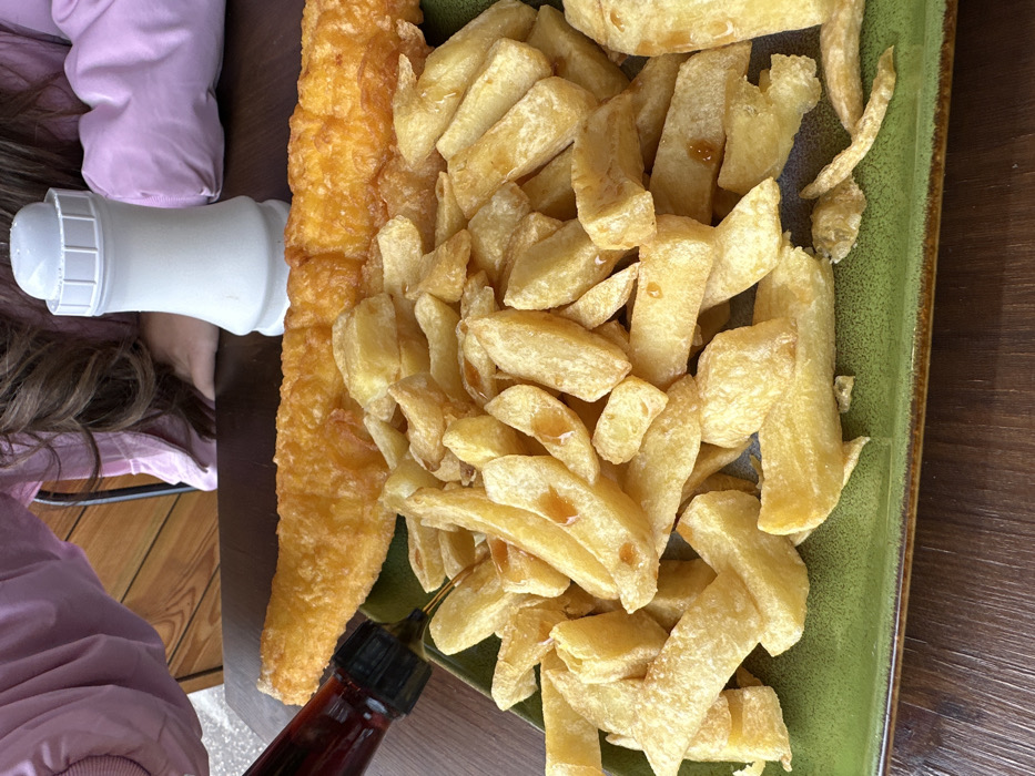 - "An overhead-angle view captures a meal of fish and chips on a green rectangular plate situated on a dark brown wooden table" by FM-XMDnw2, licensed under CC BY 4.0