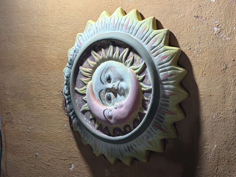A circular, decorative wall hanging depicts the sun and moon