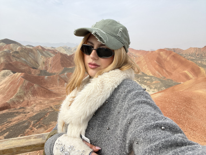 An outdoor, eye-level portrait features a female individual posing for a selfie or photograph against the backdrop of the Zhangye Danxia National Geological Park in Zhangye, China. The subject, with blonde hair, wears dark rectangular sunglasses, a distressed olive green baseball cap, a light cream faux fur collar, and a grey knitted sweater adorned with silver studs. Part of a light-colored, embellished fingerless glove is visible on her left hand. She is positioned behind a wooden railing, which is partially visible in the lower left. The background consists of expansive, undulating mountain formations exhibiting distinct horizontal stratification in vibrant hues of red, orange, yellow, and beige, indicative of the Danxia landform. The sky above is a pale, overcast grey-white.