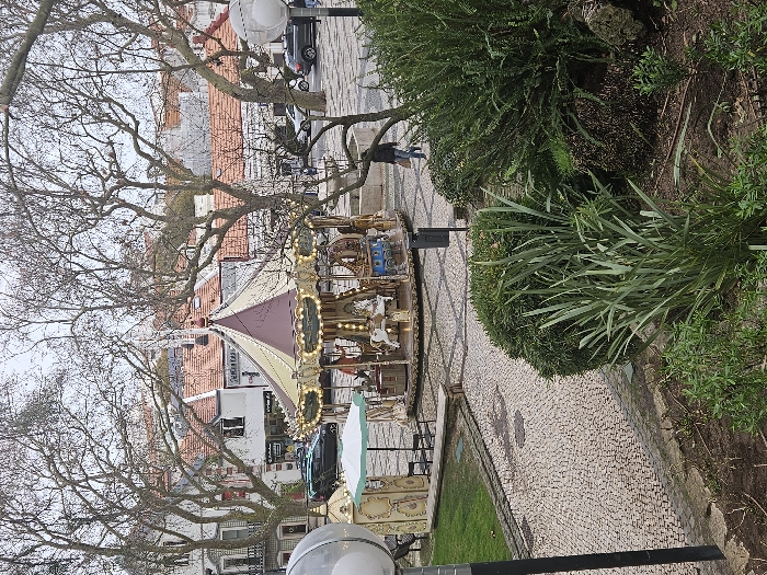 A carousel with horses and lights is set in a cobblestone square. Red-tiled roofs of buildings and bare tree branches are in the background. Green foliage and a street lamp border the carousel. A dark car is seen in the background, suggesting a street beyond the square. A person is seen walking next to the plants and next to the carousel.
