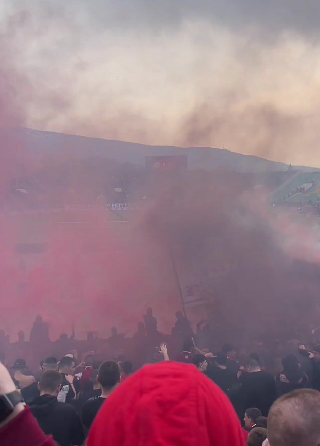 The video depicts a large crowd of people, mostly wearing red, gathered at a stadium. Red smoke and flares are filling the air, partially obscuring the view. Some individuals are holding up flags, one with a graphic design. People are recording the scene with their phones. Many are raising their fists in the air. The stadium is full of spectators, and there is a tall light tower visible in the background. The sky is overcast.