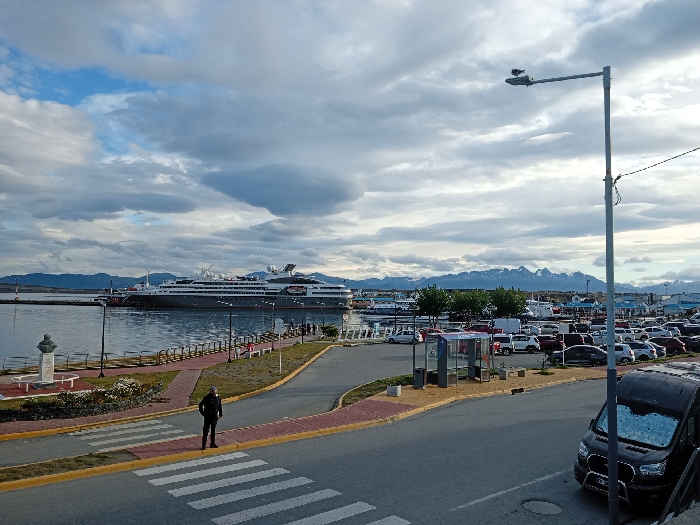 A large cruise ship is docked at a harbor with snow-capped mountains in the background. A statue sits on a small plaza, and a person stands at a crosswalk on the road that runs along the harbor. A parking lot is filled with various vehicles, and a street light pole stands tall on the right side. The sky is cloudy with patches of blue.
