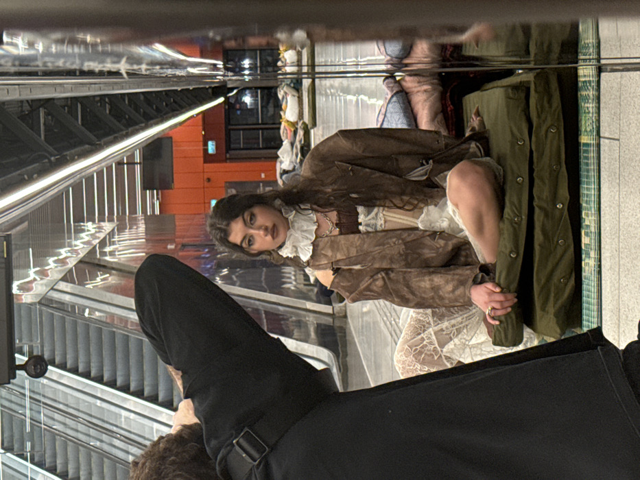 The image captures a posed photographic session occurring within the lower level of what appears to be the Tel Aviv HaHagana Train Station. In the left foreground, the upper torso and head of a person with dark, curly hair, dressed in a black garment, are visible, angled upwards as if operating a camera or phone directed at the main subject. The central figure is a young woman with long, dark, wavy hair, styled with dark eye makeup and lipstick. She wears a prominent white ruffled collar, a silver chain necklace, a brown distressed jacket over a brown corset-style top, and a white lace-patterned skirt. She is seated cross-legged on two olive-green cushions, which rest on a light green and white striped mat. Her left hand, adorned with a gold-colored ring on the ring finger, rests on the top cushion. Her expression is composed, with her gaze directed slightly away from the camera. The background features two ascending escalators, a security camera mounted overhead, and reflective surfaces creating visual distortions. Further back, an orange-paneled wall, a dark screen, and a general public area are visible. On the far right, a collection of blankets, pillows, and various personal items are stacked on the floor, indicative of a temporary shelter or encampment within the station environment.