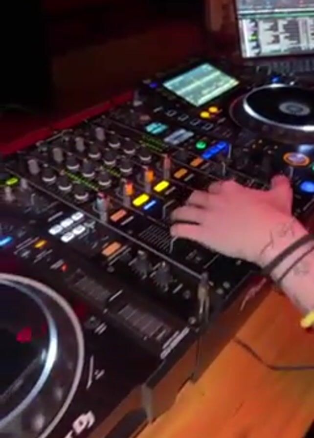A DJ is using a Pioneer DJ mixer in a dimly lit bar or club, with a laptop running DJ software beside it. Several people are dancing near the bar in the background. The lighting is mostly red. The DJ has tattoos on their arm and wears a bracelet. The crowd consists of young adults. The music is upbeat and energetic.