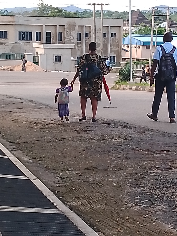This image depicts an outdoor urban scene in Adankolo, Nigeria. In the foreground, a dark metal drainage grate or culvert runs diagonally from the lower left, adjacent to a rough, unpaved shoulder consisting of dirt and small stones. The mid-ground features a paved road surface with visible cracks and inconsistencies. Three individuals are walking away from the viewer. On the left, a woman, viewed from behind, wears a multi-colored patterned dress and carries a dark backpack. A folded red umbrella is tucked under her left arm. She holds the left hand of a small child, also viewed from behind, who wears a light-colored top, a patterned skirt, and a light-colored backpack. To their right, a man, also viewed from behind, wears a light blue collared shirt, dark trousers, and sandals, carrying a black backpack. The background includes several multi-story buildings of varying styles, some appearing weathered or under construction. A large pile of light-colored material, consistent with sand or gravel, is visible near a building on the left. Utility poles with overhead lines traverse the scene. A motorcycle is partially visible on the right side of the road in the mid-distance. Distant hills or mountains are discernible on the horizon beneath a bright, overcast sky.