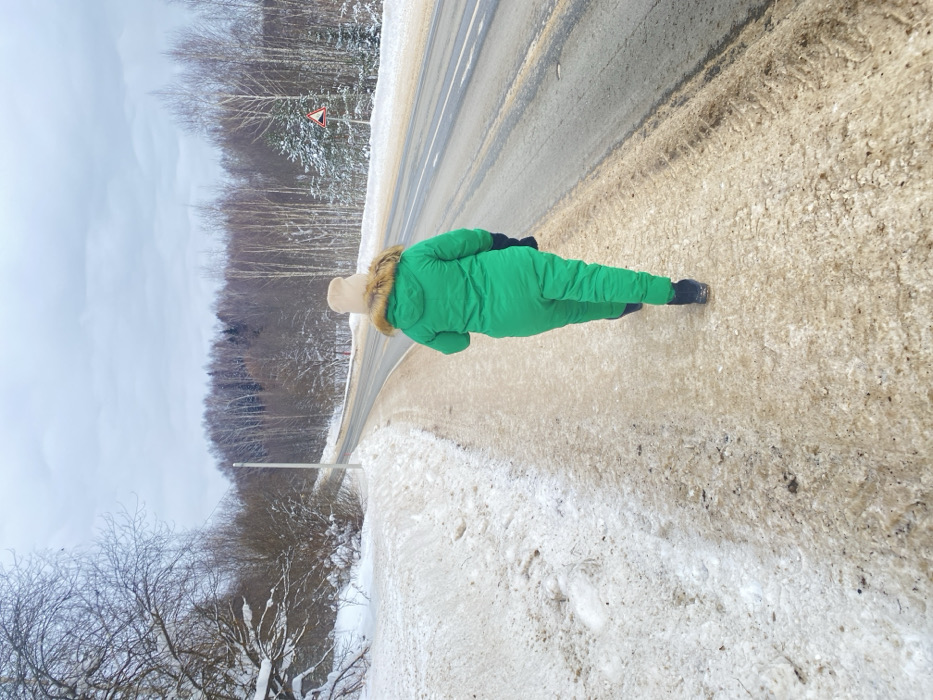 A person in a bright green snowsuit with a fur-trimmed hood walks along a snow-covered roadside. The road is visible on the left, flanked by a forest of bare trees. The sky is overcast. The snow on the roadside is dirty and melting. The person is wearing black gloves and shoes.