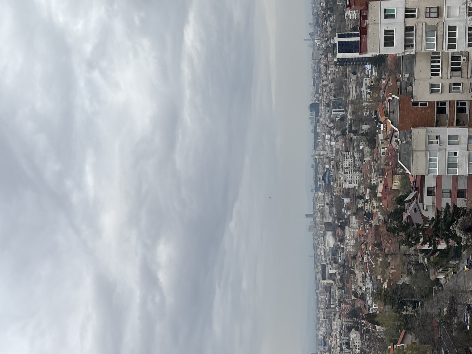 The image depicts an aerial view of Sofia, Bulgaria, under a cloudy sky. The city is densely built, with a mix of residential and commercial buildings. The buildings vary in height and architectural style, and are mostly mid-rise and low-rise structures. There are also visible trees. The sky covers over half the image and is overcast with dense cloud cover.