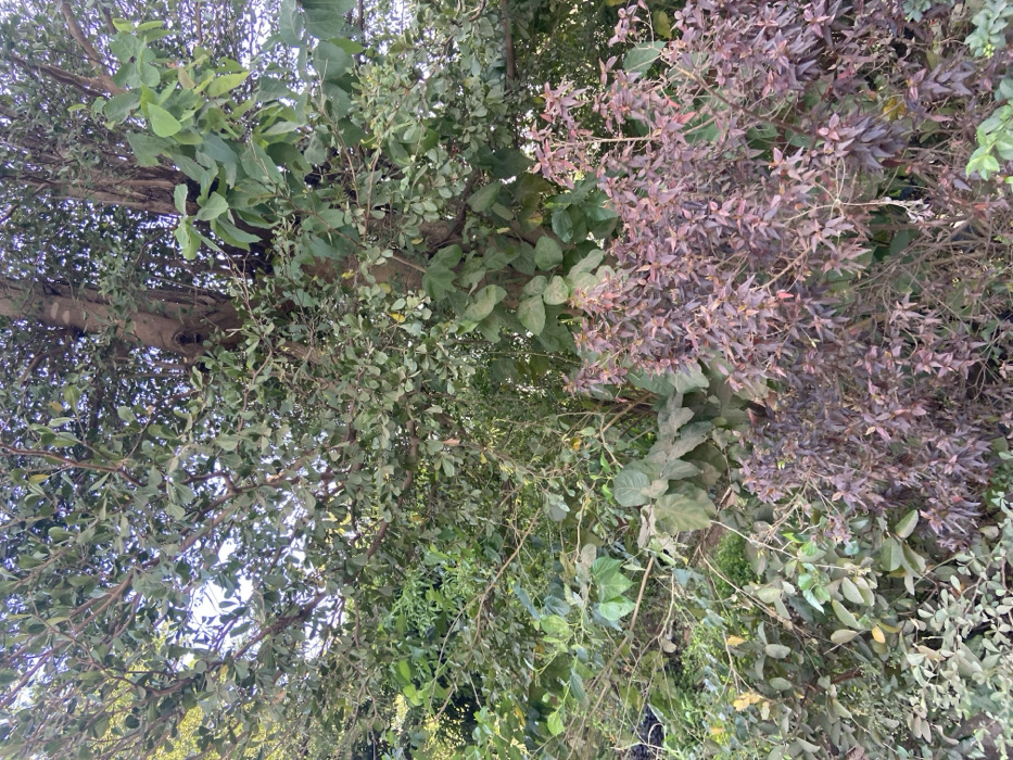 A dense canopy of trees and foliage fills the frame, looking upwards. A thick, light-colored trunk is visible on the left. Various green leaves intermingle, from small and rounded to large and ovate. A section of reddish-purple leaves stands out among the green, adding a contrasting color element. Thin branches weave through the thick vegetation, creating a textured, natural scene. A glimpse of the sky can be seen in the background.