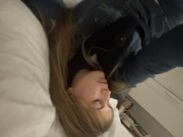 A person lies on a white pillow, their head resting on it. Their hair is light brown and flows over the pillow. They are wearing a dark-colored top and a denim jacket. A white cabinet or drawer unit is visible in the background, along with what appears to be a part of a bed frame or side table. The image has a slightly tilted perspective.