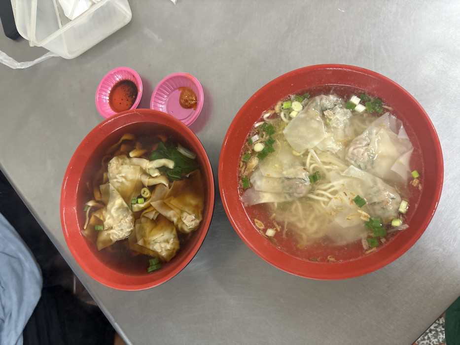 Two distinct bowls of Asian soup are positioned on a metallic, reflective dining surface in a casual eatery in Taoyuan City, Taiwan. The upper bowl contains a dark brown broth with multiple wontons, green leafy vegetables, and is garnished with chopped green onions. The lower bowl presents a lighter, clear broth with thin noodles, several wontons, and is garnished with chopped green onions and fried bits. To the right of the upper bowl, two small pink plastic condiment dishes hold a dark red chili oil and a red chili paste, respectively. A clear plastic container filled with white paper napkins is also present on the right side of the table. A person wearing a light-colored shirt and dark trousers is partially visible in the upper-left frame, seated at the table.