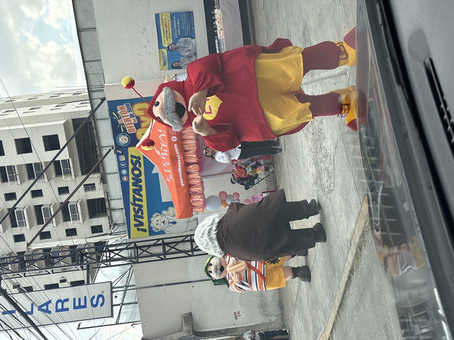 Two figures stand on a city street next to promotional materials. One figure is dressed as El Chapulín Colorado, a comedic superhero. The second is in a dark brown coat and wearing a hat. In the background is a white building with multiple square windows. A sign advertises "Oferton del Dr. Simi," along with social media icons. Another banner says "VISITANOS! EternalSecret.com." A portion of a sign reading "ARES" is also visible. The scene appears to be viewed from inside a vehicle.