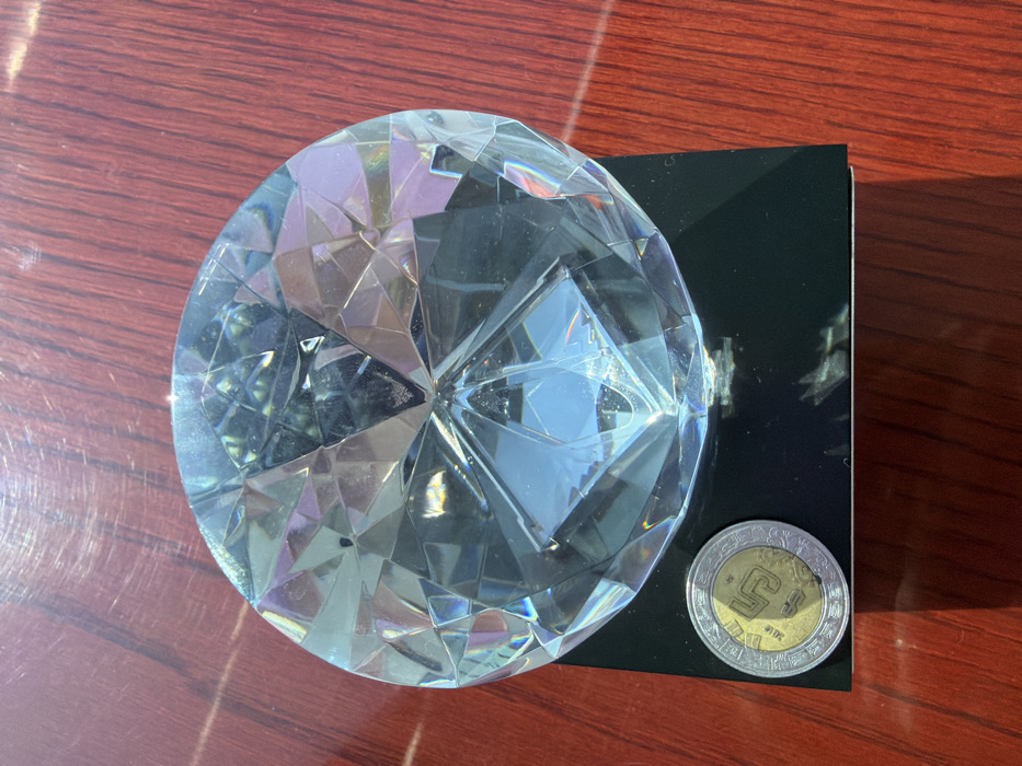 The scene depicts a large, clear, faceted object resembling a brilliant-cut diamond, made of crystal or glass, resting on a black square base. A bimetallic Mexican 5-peso coin, dated 2019, is positioned on the polished wooden surface adjacent to the black base. The diamond replica reflects and refracts light, exhibiting iridescent flares. The wooden surface, possibly a tabletop, displays a reddish-brown hue with visible grain patterns and numerous fine scratches. Strong, direct illumination is present, casting distinct shadows and highlighting surface details. No individuals are present. This scene is reported to be located in Naucalpan de Juárez, Mexico.