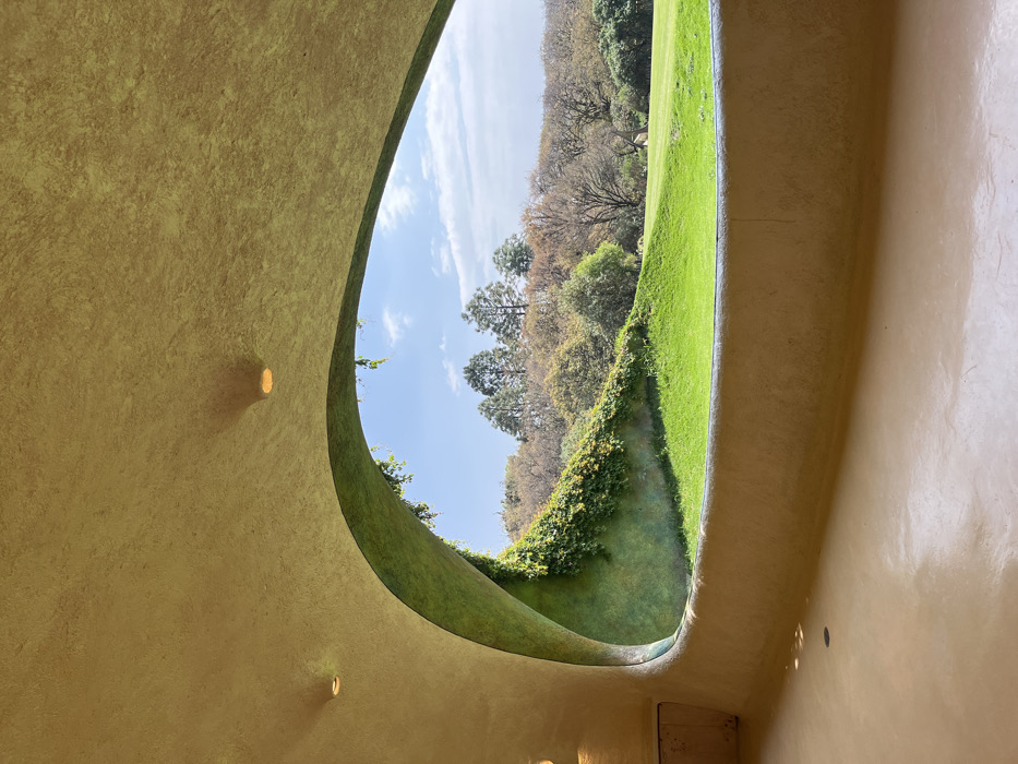 The image displays an interior architectural space with smooth, curvilinear forms and textured surfaces, overlooking an exterior landscape in Naucalpan de Juárez, Mexico. The interior walls, ceiling, and floor are uniformly colored in a light brownish-yellow tone. Two recessed circular light fixtures are visible in the ceiling, emitting a warm glow. A large, organically shaped aperture frames the external view. Beyond this opening, a vibrant green, undulating lawn slopes downwards and then upwards. To the left of the lawn, a curved wall or embankment is densely covered with green climbing vegetation. In the mid-ground and background, a dense forest comprises various trees, including prominent coniferous trees and deciduous trees with sparse foliage. The sky above is clear blue with scattered white clouds. No individuals are present in the scene. A small circular drain or cover is visible on the interior floor, and a subtle rectangular recess is present on the left interior wall.