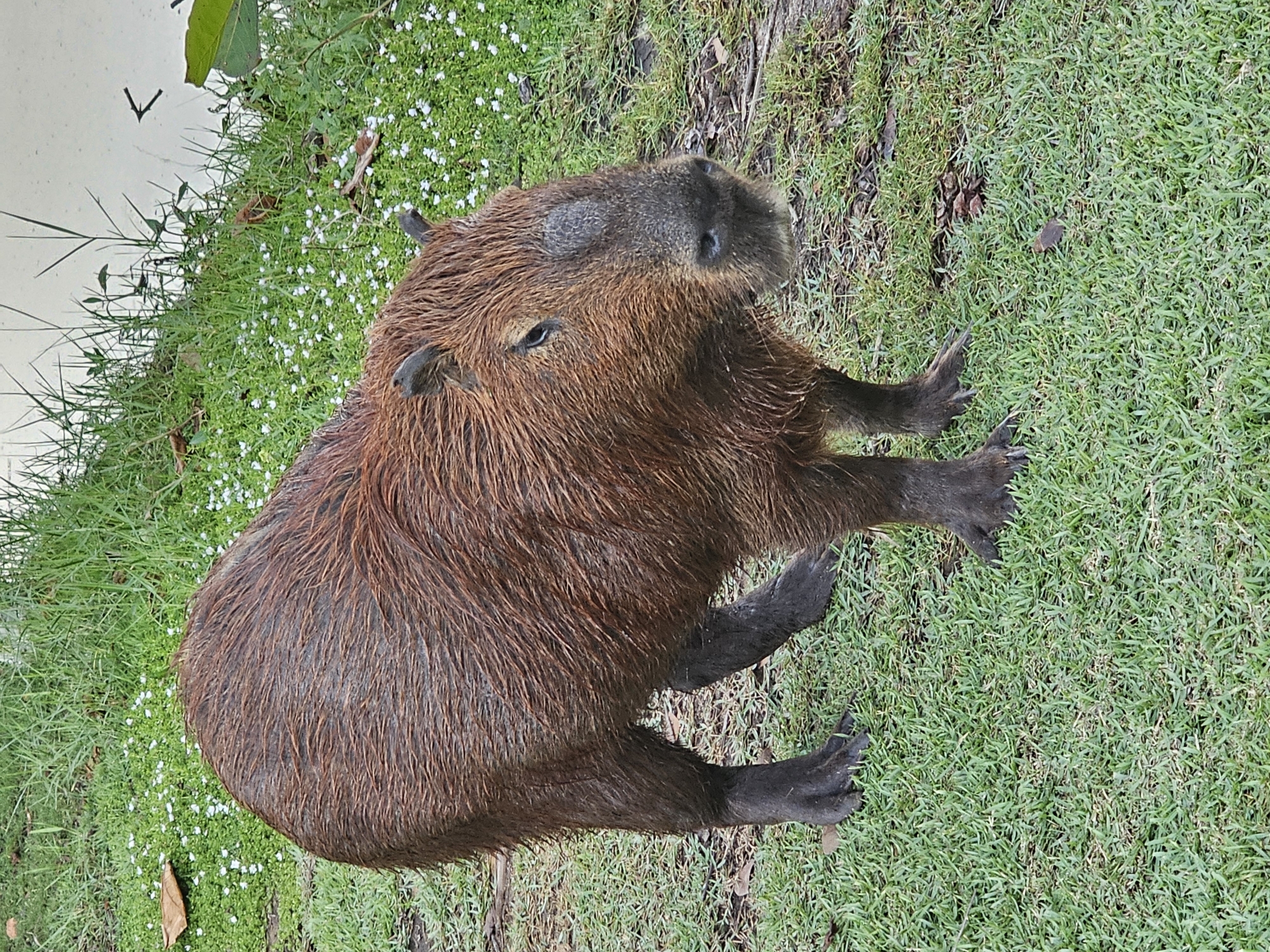 A capybara sits on grass near a body of water