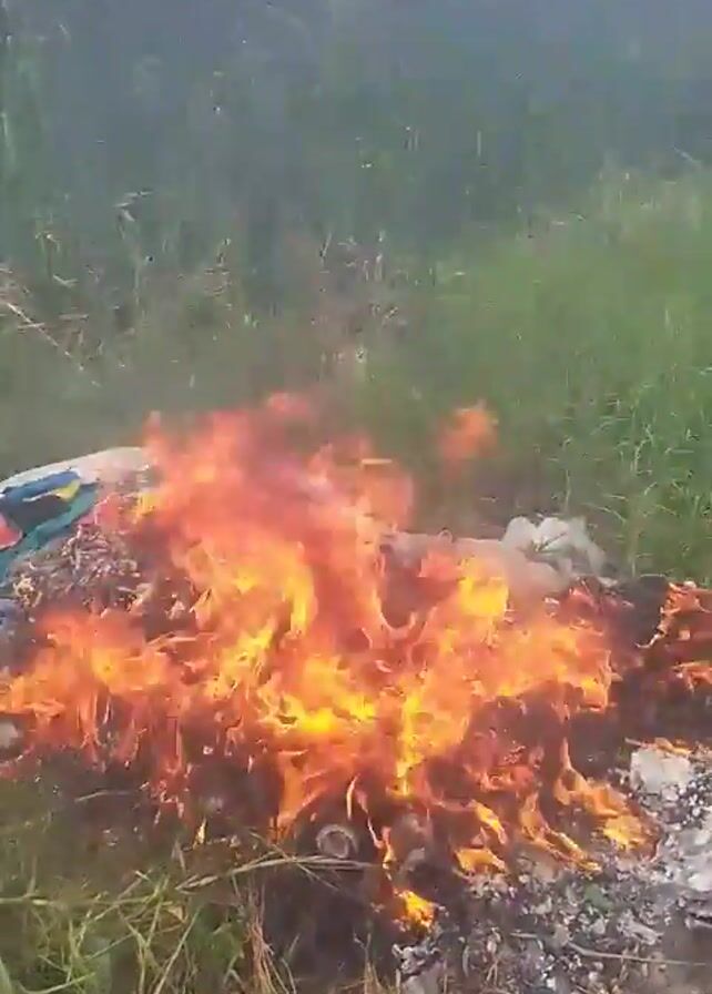 fire burning on the ground in a grassy area. The flames are orange and yellow, and smoke is visible. There appears to be trash and debris within the fire. The grass surrounding the fire is green. The camera is static.