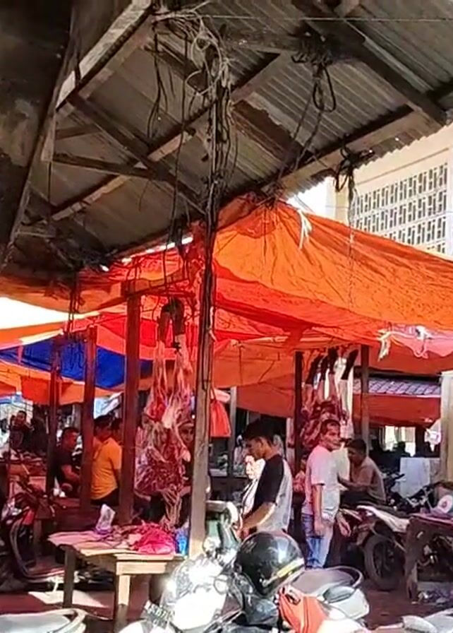 n outdoor market, possibly in Southeast Asia. Several stalls are visible, covered with orange and blue tarps. Hanging from the stalls are cuts of raw meat. Several people are present, some standing near the meat, others sitting. There are also several parked motorbikes. The market appears to be open and active.