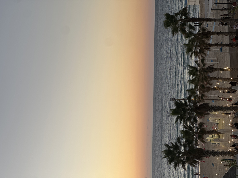 The image depicts the beach in Bat Yam, Israel, during twilight. The upper sky is light blue-gray, transitioning to an orange-pink gradient at the horizon. The dark blue sea exhibits visible waves approaching the shore; a faint, distant vessel or object is discernable on the horizon. The sandy beach features a line of eight distinct palm trees. Beneath these trees, an outdoor area is illuminated by strung lights, revealing multiple tables and chairs. Numerous indistinct individuals are seated at these tables or standing within this illuminated zone. Additional individuals are observed walking along the waterline on the beach, and near white, stacked beach umbrellas and other white structures, possibly storage huts. A single tall, dark-colored light pole is positioned between two central palm trees.