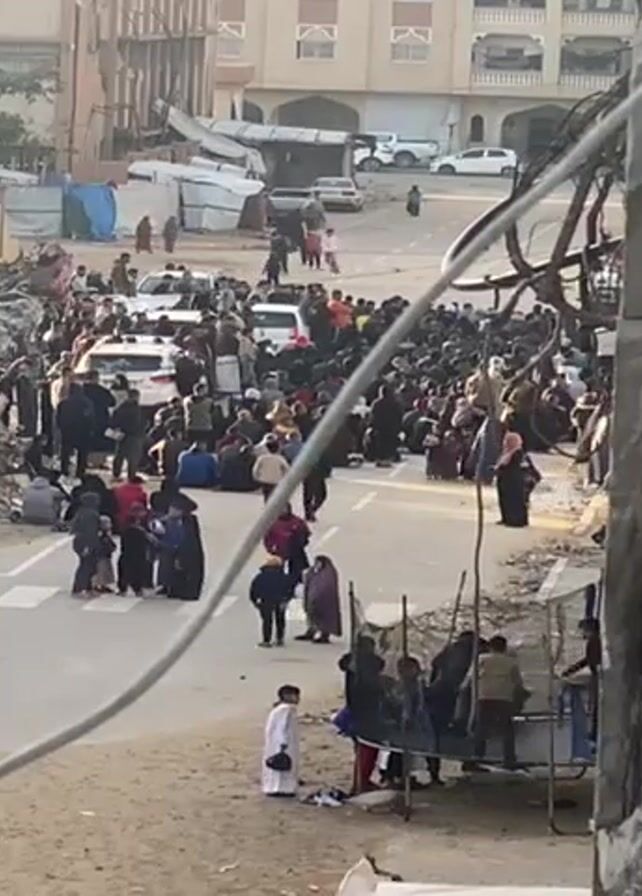 large crowd of people gathered in a street amidst rubble and damaged buildings. Some people are sitting or standing on the street, while others are walking around. There are several vehicles, including white SUVs, parked in the area. Debris from destroyed buildings is visible on either side of the street. The overall atmosphere appears chaotic and somber, suggesting a disaster or emergency situation. The sound of people chanting can be heard in the background.