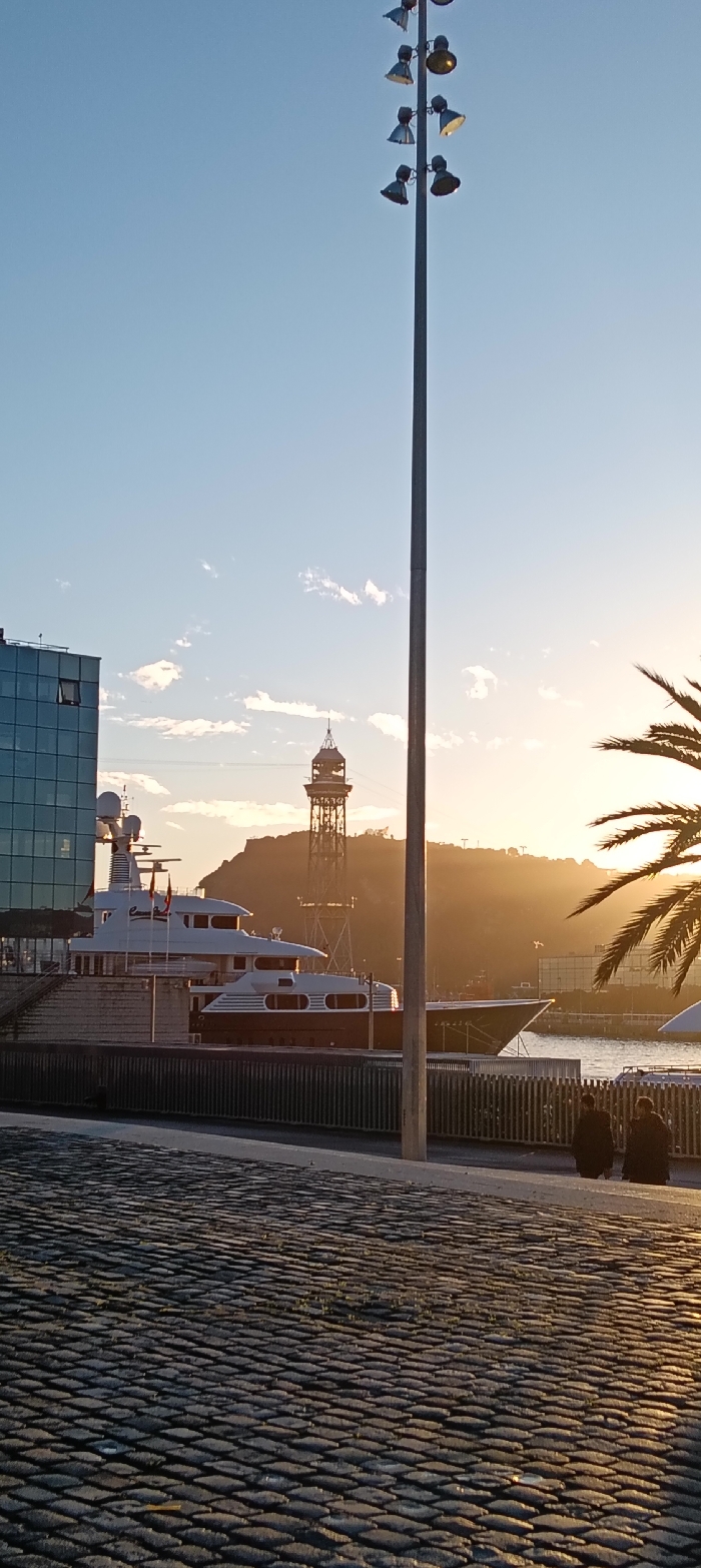 A cityscape features cobblestones in the foreground, leading to a low fence separating the ground from the waterfront. Beyond the fence, a large yacht is docked, partially obscured by a modern glass building to the left. In the distance, a tower stands on a hill, bathed in the warm glow of the setting sun. A tall lamppost dominates the center, while a palm frond peeks in from the right edge. Two figures sit near the fence, observing the harbor scene.