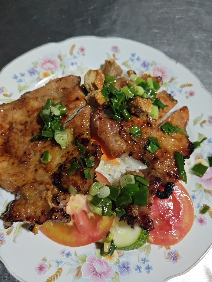 - "A plate of Vietnamese cơm tấm features grilled pork chops, broken rice, and fresh vegetables" by FM-CuMMb2, licensed under CC BY 4.0