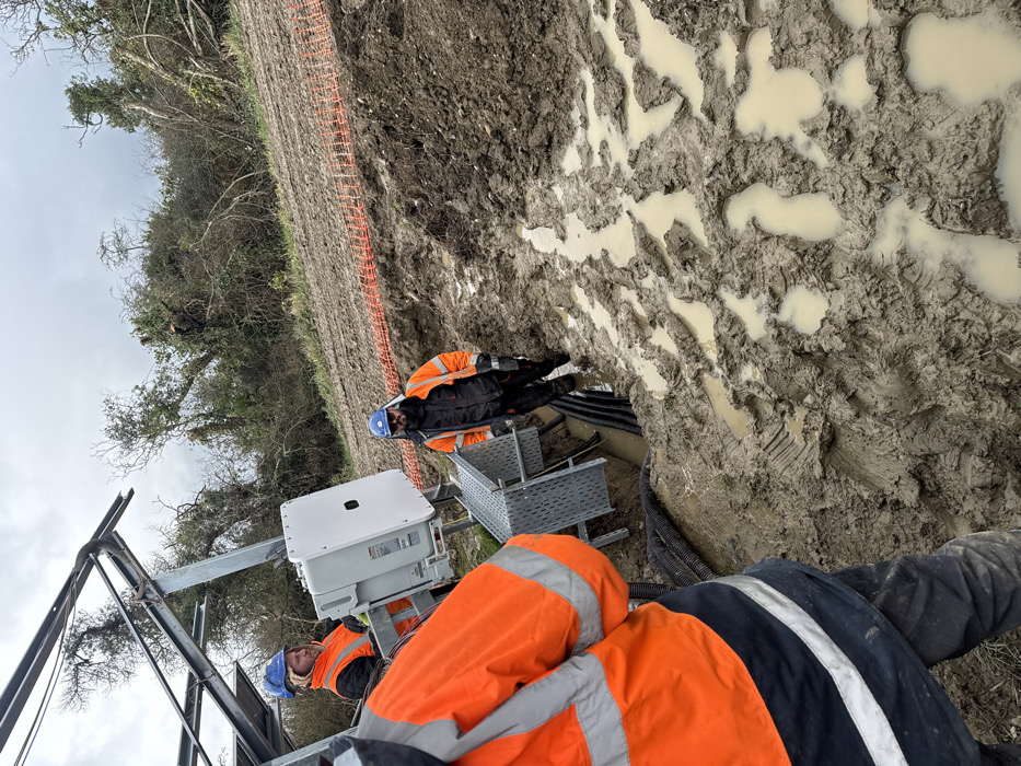 An outdoor work site at Baldurgan Hill, Ireland, displays three male workers in varying positions on muddy terrain under an overcast sky