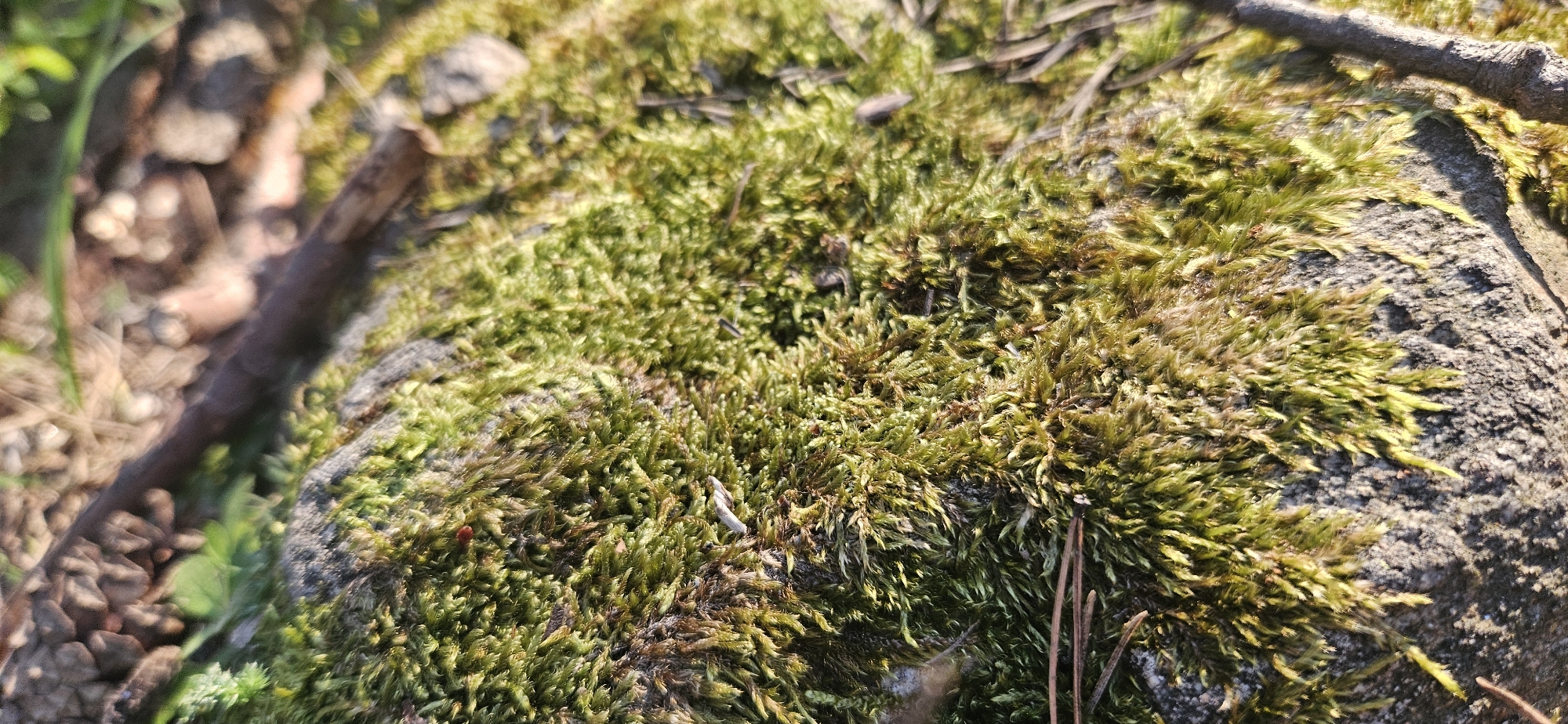 The image depicts a close-up view of moss growing on a rock surface. The moss is a vibrant green color, with some areas showing a brownish hue. A few pine needles are scattered among the moss. To the left of the image, there is a blurry view of a twig or branch and some pebbles. The location is Kostenets, Bulgaria, inferred from the presence of specific vegetation in that area.