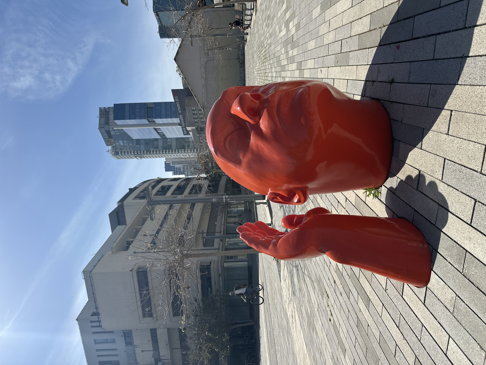 The image depicts an outdoor urban plaza, specifically identified as Rothschild Boulevard in Tel Aviv, Israel, due to the distinctive red sculpture and prominent "בנק הפועלים" (Bank Hapoalim) signage on a background high-rise. In the foreground and center, a large, glossy, bright red sculpture is present, consisting of two separate pieces: a human head and a left human hand. The head lies on its right side on the paved ground, facing upwards and slightly to the right of the frame, with closed eyes and a tranquil expression. To its immediate left, the left hand stands upright, emerging from the ground, with fingers slightly curled. Both sculpture components cast distinct, dark shadows on the paving, indicating direct sunlight from a high angle. Small patches of green vegetation are visible growing between the pavers at the base of the sculpture. The ground of the plaza is paved with light grey rectangular interlocking pavers arranged in a staggered pattern. In the mid-ground on the left, a male individual is riding a bicycle from left to right. He wears a light-colored beanie, a light jacket, and dark pants. His bicycle is dark-colored. Further into the background on the far right, another individual is seated on a light-colored public bench, wearing dark clothing and appearing to be engaged with an object in their hands. The background features a mix of architectural styles. To the left, a multi-story, light-colored concrete building with horizontal windows is visible. Several bare deciduous trees with thin branches are scattered across the mid-ground. To the right, modern glass-fronted high-rise buildings dominate the skyline, one clearly displaying the "בנק הפועלים" (Bank Hapoalim) logo in Hebrew. An older, single-story, light-colored building with a gabled roof is positioned in front of these skyscrapers. The sky is clear blue with minimal, wispy white clouds. The bright, overhead sunlight and sharp shadows suggest a daytime scene, likely mid-morning to early afternoon.