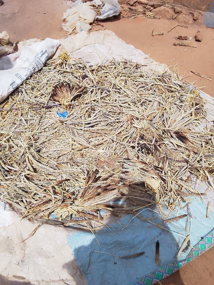 pile of dried palm fronds, likely for use as thatch, in Kwal, Nigeria, located at latitude 9.803 and longitude 8.646. The fronds are arranged on a white sheet, partially covered by a white plastic bag with some writing on it. A small blue plastic bag lies partially obscured near the center of the pile. The fronds are dry and brittle, and there is some debris on the ground around the pile. The image appears to have been taken on a sunny day, as the ground is dry and the fronds are casting shadows. The image was taken at ground level, and the focus is on the pile of fronds.