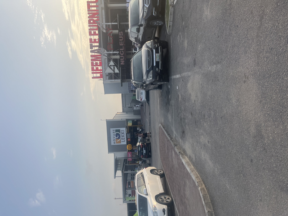 A shopping center parking lot on a sunny day. Several cars are parked in designated spots. Signs for "LIFEMATE FURNITURE" and "NOVARE LEKKI" are visible on the buildings. The pavement appears to be in good condition, with clear lane markings. The sky is clear with some clouds.