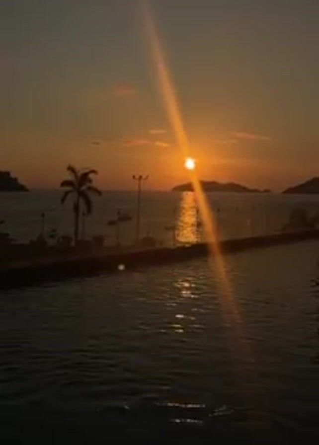 sunset over the ocean, with an infinity pool in the foreground. The sun is setting behind some land masses in the distance, creating a bright reflection on the water. A palm tree is visible to the left of the frame, and a few lights line the edge of the pool. The sky is a gradient of orange and yellow. The pool water is dark and rippling.