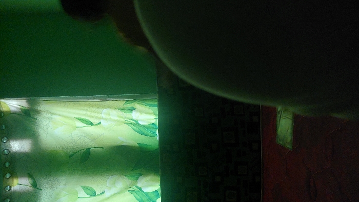 person sitting in a room, facing a window. The window has a patterned curtain with light green and white floral designs. The room's walls are painted a dark green color. The person is sitting on what appears to be a bed, with a dark patterned fabric. The bedspread is red. There is a small rectangular object, possibly a book or a piece of paper, lying on the red bedspread. The person is only partially visible in the frame and their face is not visible. The focus of the image is on the person and the patterned curtain. The image was taken inside a room located in the city of Kecamatan Babakan Madang, Indonesia, at the coordinates latitude: -6.561, longitude: 106.863.