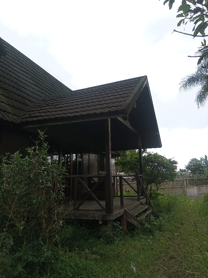 A dark-colored wooden house with a porch sits under a cloudy sky. The house has a tiled roof and a wooden porch with railings and steps. Lush green vegetation surrounds the house, including grass and bushes. A fence is visible in the background, bordering the property. The scene appears overgrown and slightly unkempt, suggesting the house might be old or infrequently maintained.